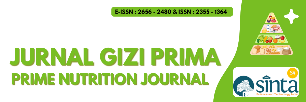 Upon the acceptance of the article by the Editorial Board of Jurnal Gizi Prima (Prime Nutrition Journal) and the decision to publish it, the copyright for the article will be transferred to Jurnal Gizi Prima (Prime Nutrition Journal), published by Poltekkes kemenkes Mataram. Poltekkes kemenkes Mataram as the publisher of Jurnal Gizi Prima (Prime Nutrition Journal) holds the copyright to all published articles in this journal.